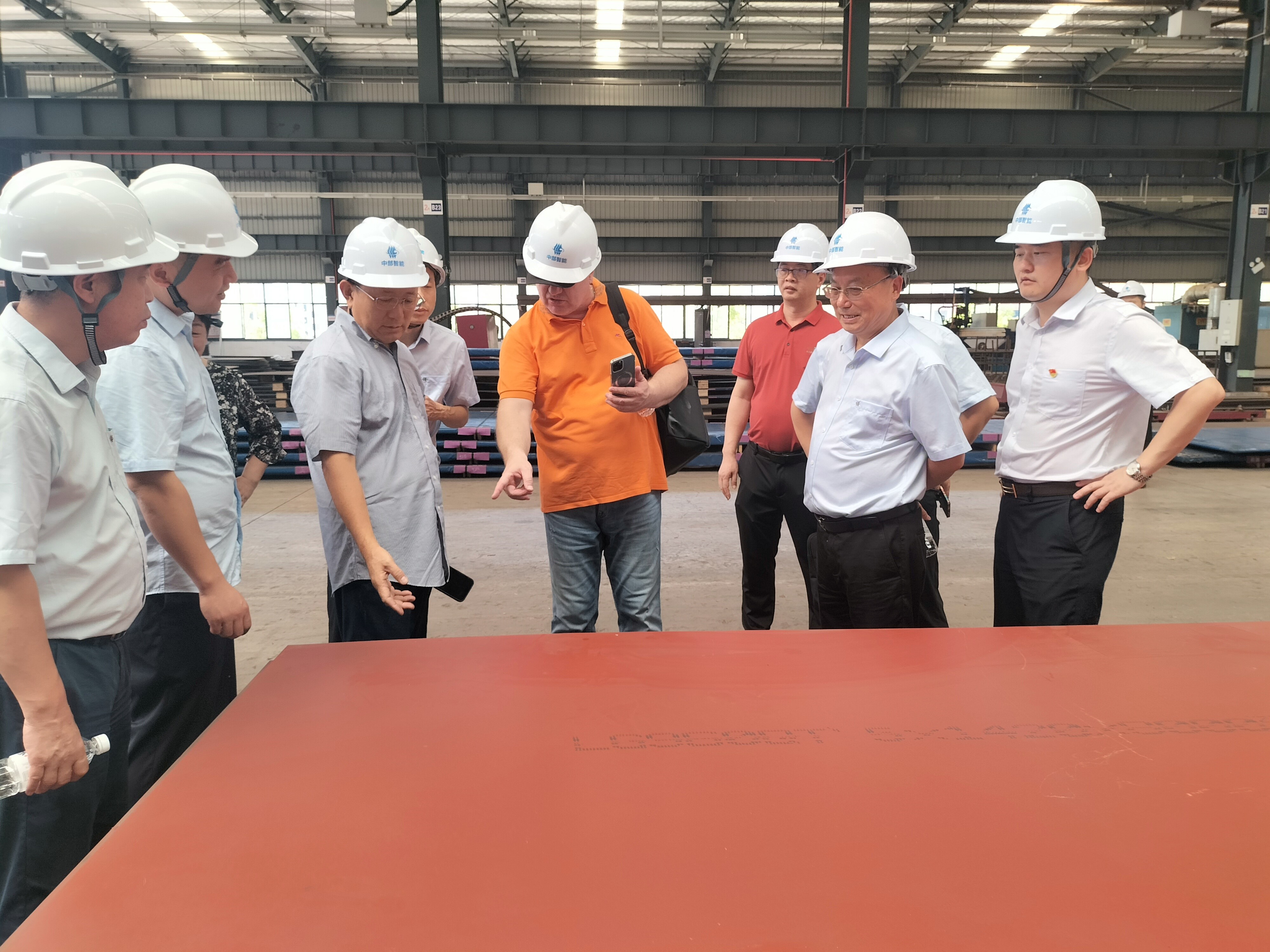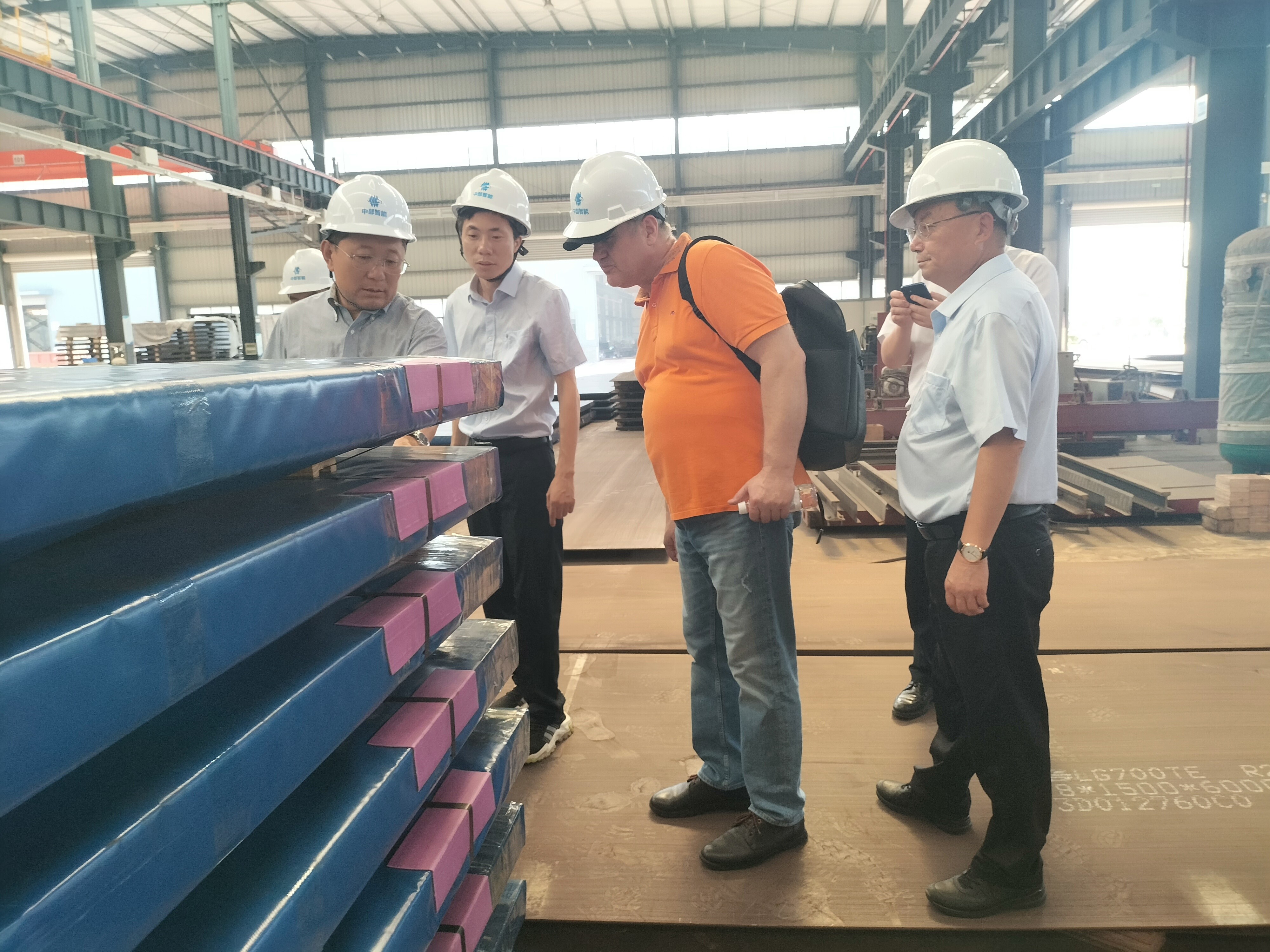俄罗斯古杰斯尼克集团采购总监、俄华通何立夫董事长一行在中钢集团董事长等带领下,参观了中部智能生产车间,董事长详细介绍了车间的相关生产设备如下料生产设备、预处理生产线及钢板校平生产线等,俄罗斯古杰斯尼克集团采购总监对发往俄罗斯的钢板打包工艺特别关心,详细询问了过程并进行了深入交流。