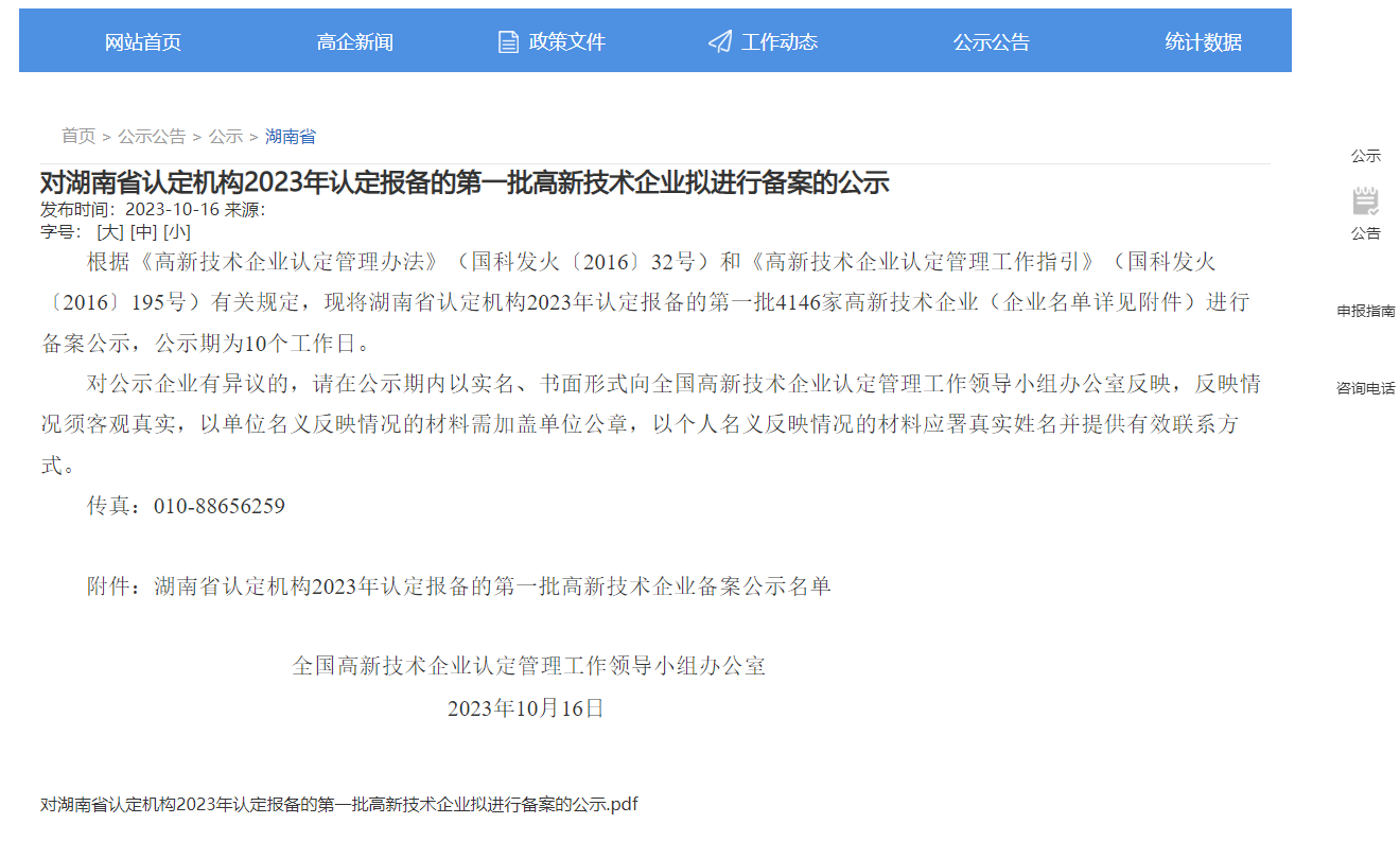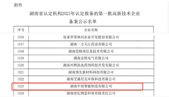 2023年10月16日,湖南中部智能制造有限公司荣获湖南省认定机构2023年认定报备的第一批高新技术企业拟进行备案的公示榜单。顺利通过高新技术企业认定,中部智能的研发与技术成果转化等方面的实力获得认可,这将进一步提升公司市场竞争力和影响力。